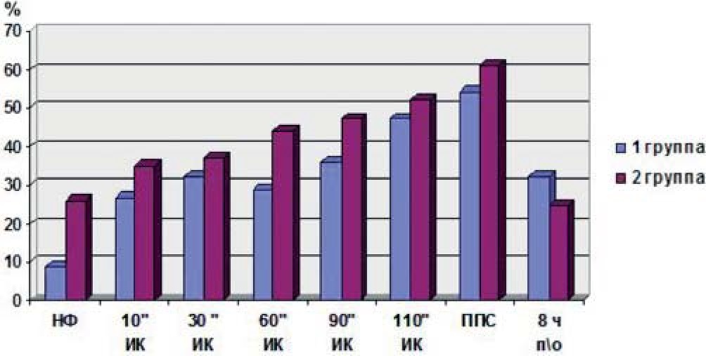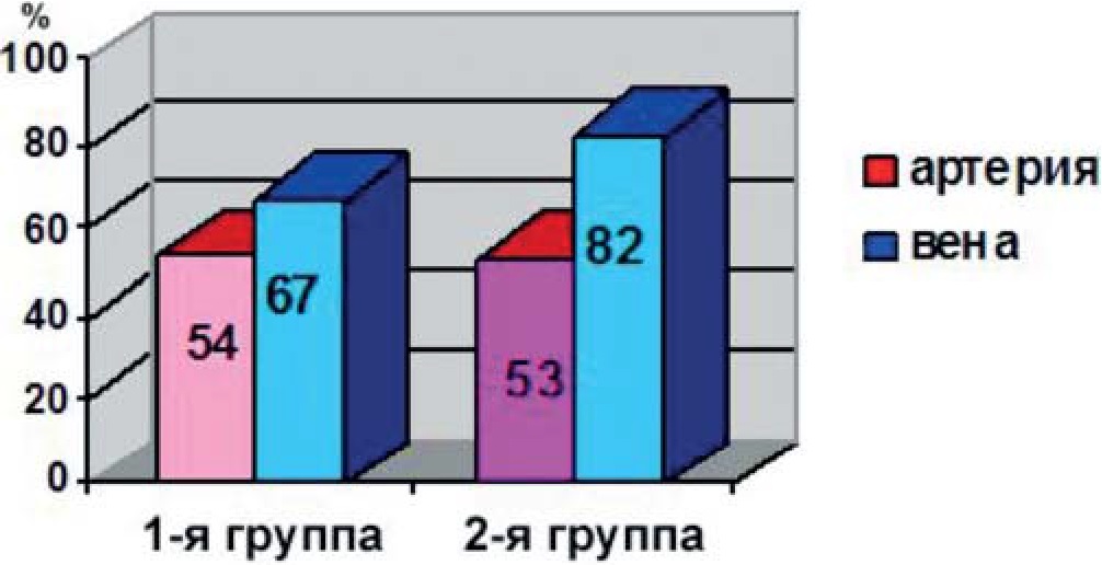 Через 8 ч после операции содержание крупноворсистых форм эритроцитов в 1-й группе составило 32±6% в артериальной и 71±9% в венозной крови, в 1-е сутки – 33±9% в артериальной и 69±12% в венозной крови. Во 2-й группе через 8 ч после операции содержание крупноворсистых форм эритроцитов составило 25±5% в артериальной и 77±8% в венозной крови, а в 1-е сутки – 21±3% в артериальной и 84±8% в венозной крови.