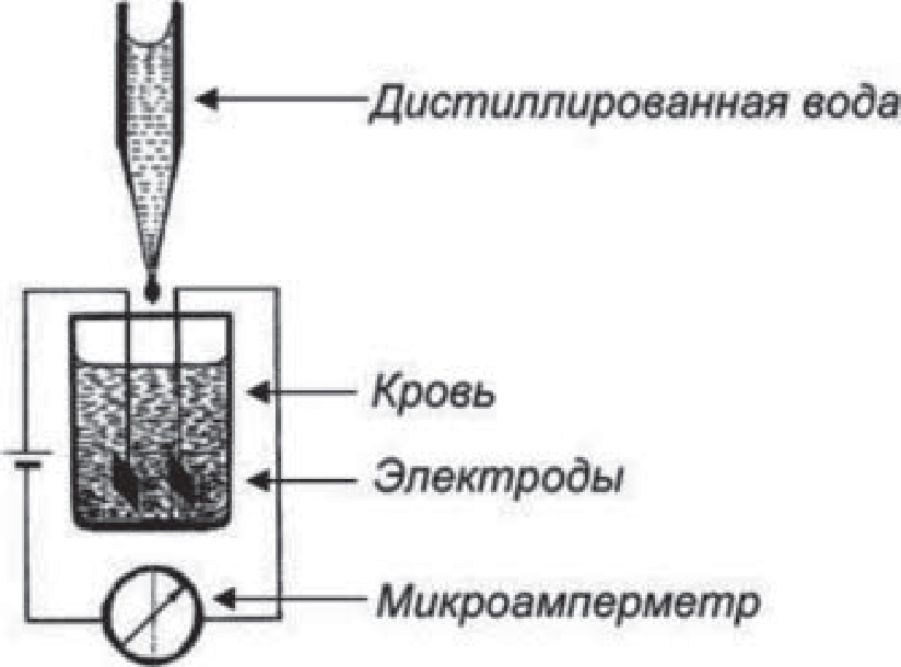 Степень повреждаемости эритроцитов во время ИК оценивали по их осмотической резистентности на 5–10-й мин ИК и в конце операции (на 90–120-й мин ИК). Для анализа брали 2,5 мл крови до входа её в оксигенатор (венозная) и последовательно разбавляли её порциями дистиллированной воды по 0,5 мл (всего 10 разбавлений). При этом регистрировали ток, проходящий через кровь при её разбавлении. Для сравнения строили кривую изменения проводимости изоосмотического физиологического раствора при аналогичном разведении. На рисунке 6 представлена схема опыта.