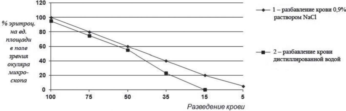 Для определения достоверности результатов по ОРЭ полученные данные сравнивали с морфометрическим определением гематокрита при разбавлении образцов крови дистиллированной водой, как указывалось выше, и числом эритроцитов в поле зрения микроскопа в проходящем свете. При уменьшении осмолярности раствора на 50% наблюдается уменьшение гематокрита, отличающегося от такового при разбавлении крови 0,9% NaСl (рис. 8). Это объясняется тем, что разрушенные эритроциты не видны в поле зрения светового микроскопа. Помимо уменьшения количества эритроцитов происходит нарушение их формы. В большом числе начинают встречаться эритроциты как с увеличенным диаметром до 8–9 мкм, так и более мелкие (диаметр 5–6 мкм). Кроме того, наблюдается появление в значительном количестве пойкиломорфных форм эритроцитов.