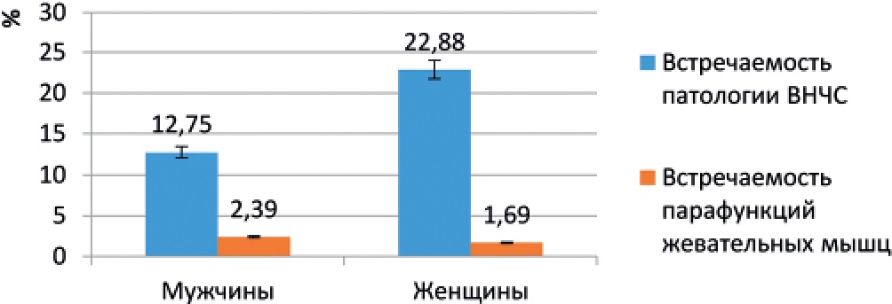 Рис. 1. Встречаемость патологии ВНЧС и жевательных мышц у военнослужащих с учётом пола