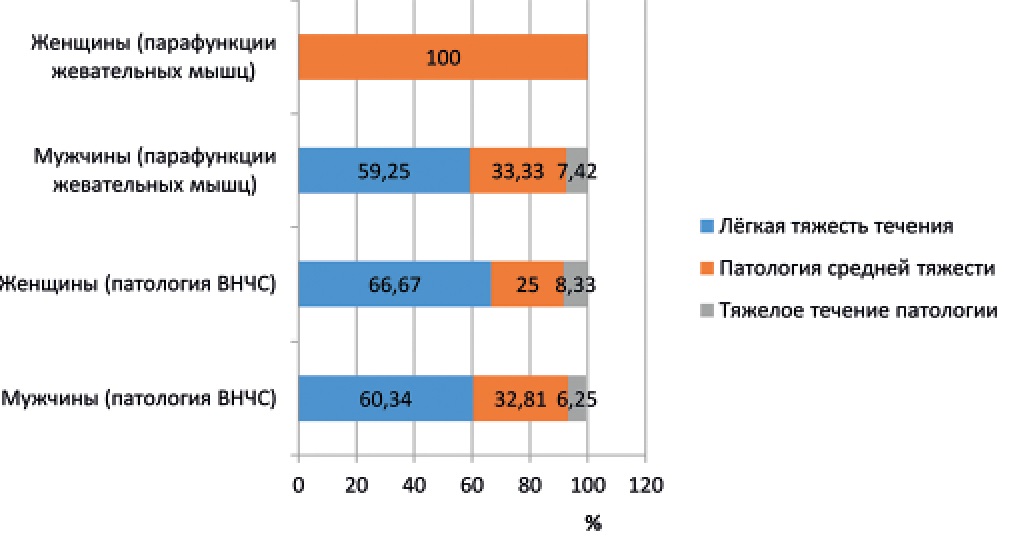 Рис. 2. Особенности клинического течения патологии ВНЧС и жевательных мышц у военнослужащих с учётом пола