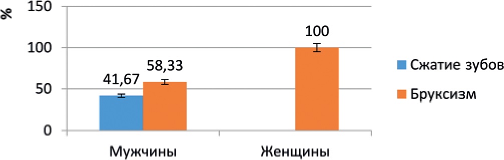 Патология жевательных мышц выявлялась у военнослужащих-женщин значительно реже, чем заболевания ВНЧС (р≤0,05), а именно в 1,69% случаев, то есть у 2 человек. У обеих обследованных была диагностирована форма парафункции жевательных мышц в виде скрежетания зубами, то есть бруксизм (см. рис. 3). У этих женщин патология жевательных мышц сочеталась с патологией ВНЧС и имела среднюю степень тяжести течения (см. рис. 2).
