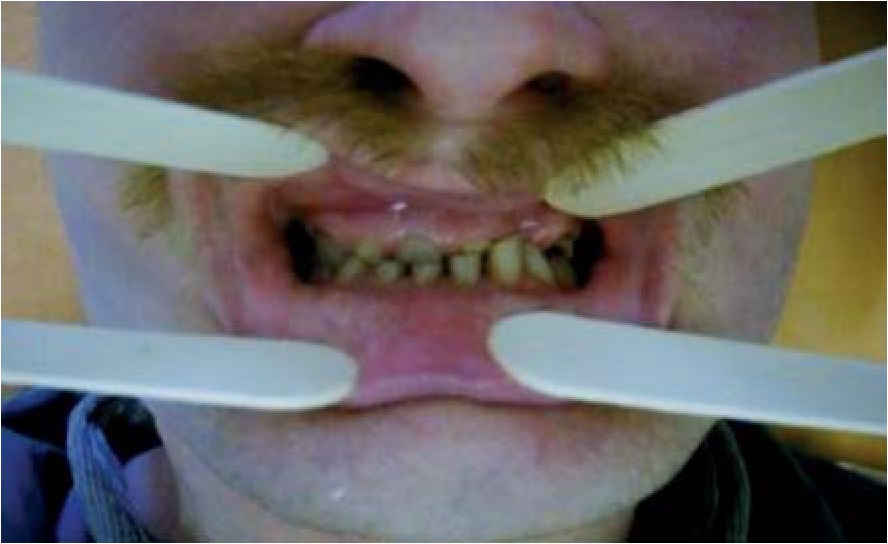 Рис. 4. Военнослужащий М., 49 лет, страдающий дисфункцией ВНЧС и бруксизмом, осложнённым генерализованной формой горизонтальной III степени повышенной стираемостью зубов обеих челюстей и снижением межальвеолярного расстояния