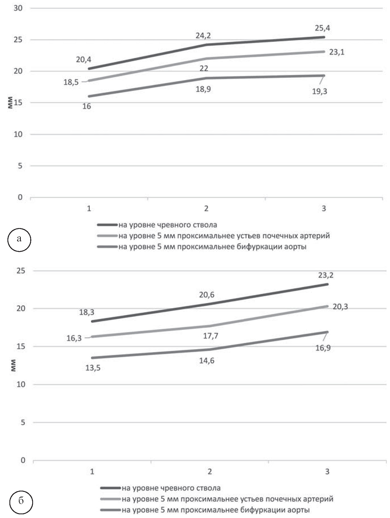 Диаметр аорты на уровне чревного ствола, мм | М | 20,4±0,62, 3 | 24,2±0,21,3 | 25,4±0,21,2 |