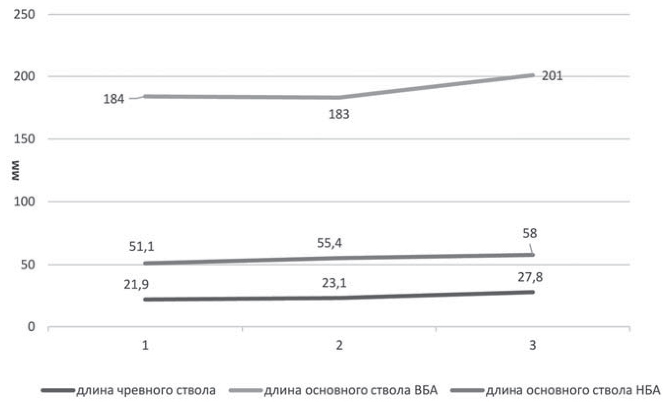 Установлено, что у мужчин длина брюшного отдела аорты, чревного ствола и длина основного ствола ВБА с возрастом достоверно не изменяются (p˂0,05), при этом у женщин длина чревного ствола с возрастом увеличивается на 5,9 мм, а длина основного ствола ВБА – на 17 мм (рис. 2).