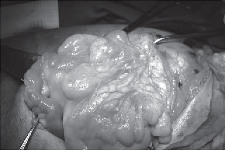В правой паховой области параллельно паховой связке выполнен разрез длиной 18 см. Послойно рассечены мягкие ткани и апоневроз наружной косой мышцы живота, выделен и вскрыт грыжевой мешок размерами 44×25 см. Его содержимым являлись петли тонкой кишки протяженностью около 1,5 м, слепая кишка с червеобразным отростком, участок восходящего отдела ободочной кишки (рис. 2).