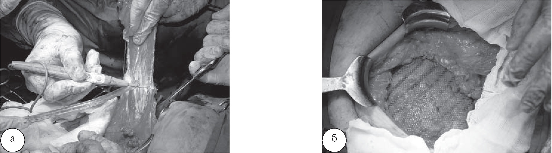 Рис. 3. Иссечение грыжевого мешка (а); пластика грыжевых ворот сетчатым эксплантатом (б)