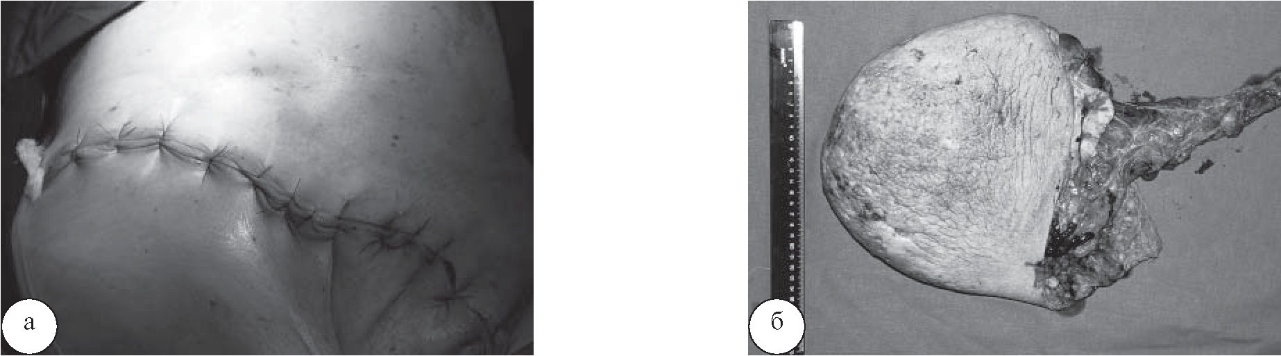 Рис. 4. Окончательный вид послеоперационной раны (а); макропрепарат, иссеченный избыток кожи с грыжевым мешком (б)