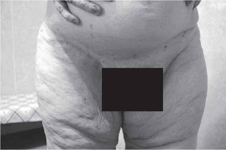 При поступлении пациентки состояние удовлетворительное. Температура тела 36,8оС. Кожный покров и видимые слизистые обычного цвета. Дыхание жесткое, проводилось во все отделы. Хрипы не выслушивались. Частота дыхательных движений 14 в минуту. Язык влажный. Живот при пальпации мягкий, безболезненный. Мочеиспускание свободное, диурез достаточный. Стул ежедневный, оформленный. В правой паховой области – грыжевое выпячивание размерами 44×23 см, опускающееся до уровня правого коленного сустава. Кожа в области грыжи гипертрофирована, с участками мацерации размерами от 0,5 до 2 см (рис. 1). При пальпации выпячивание мягко-эластичной консистенции, безболезненное, в брюшную полость невправимое. Симптом «кашлевого толчка» положительный. В результате обследования данных за ущемление грыжи не получено. Показаний к срочной операции не было.