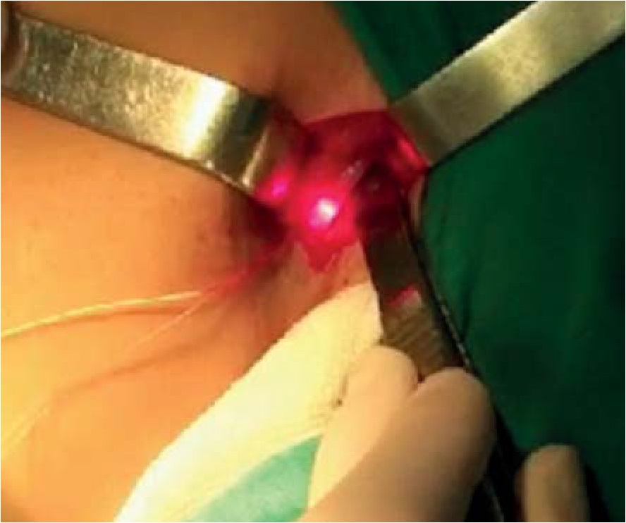 - Использование лазерного луча на конце рабочей части световода, предварительно проведенного под ультразвуковым контролем непосредственно в область впадения БПВ в глубокую систему, как визуальный ориентир значительно облегчает поиск магистральной подкожной вены, особенно у тучных пациентов.
