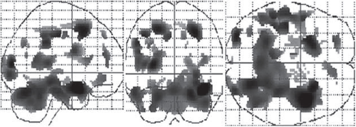 После двух курсов МПБТ постепенная положительная динамика энергетического метаболизма (по данным позитронно-эмиссионной томографии) у пациентки К. была выявлена в лобной, височной, затылочной долях, передних подкорковых ядрах обоих полушарий, таламусе, стволе мозга, мозжечке (рис. 3). Это соответствует представленным выше «общим» данным.