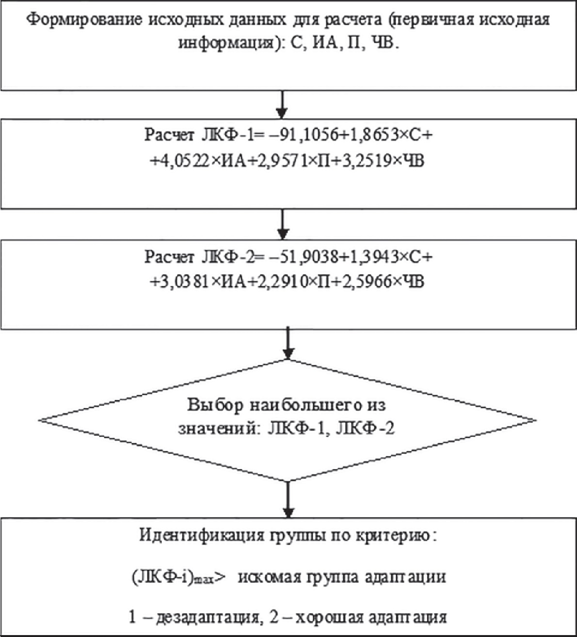 Для определения прогноза военно-профессиональной дезадаптации курсантов военного вуза производят расчет по всем имеющимся формулам, та группа, результаты которой являются наибольшими и является искомой. Для ЛКФ данная процедура является стандартной.