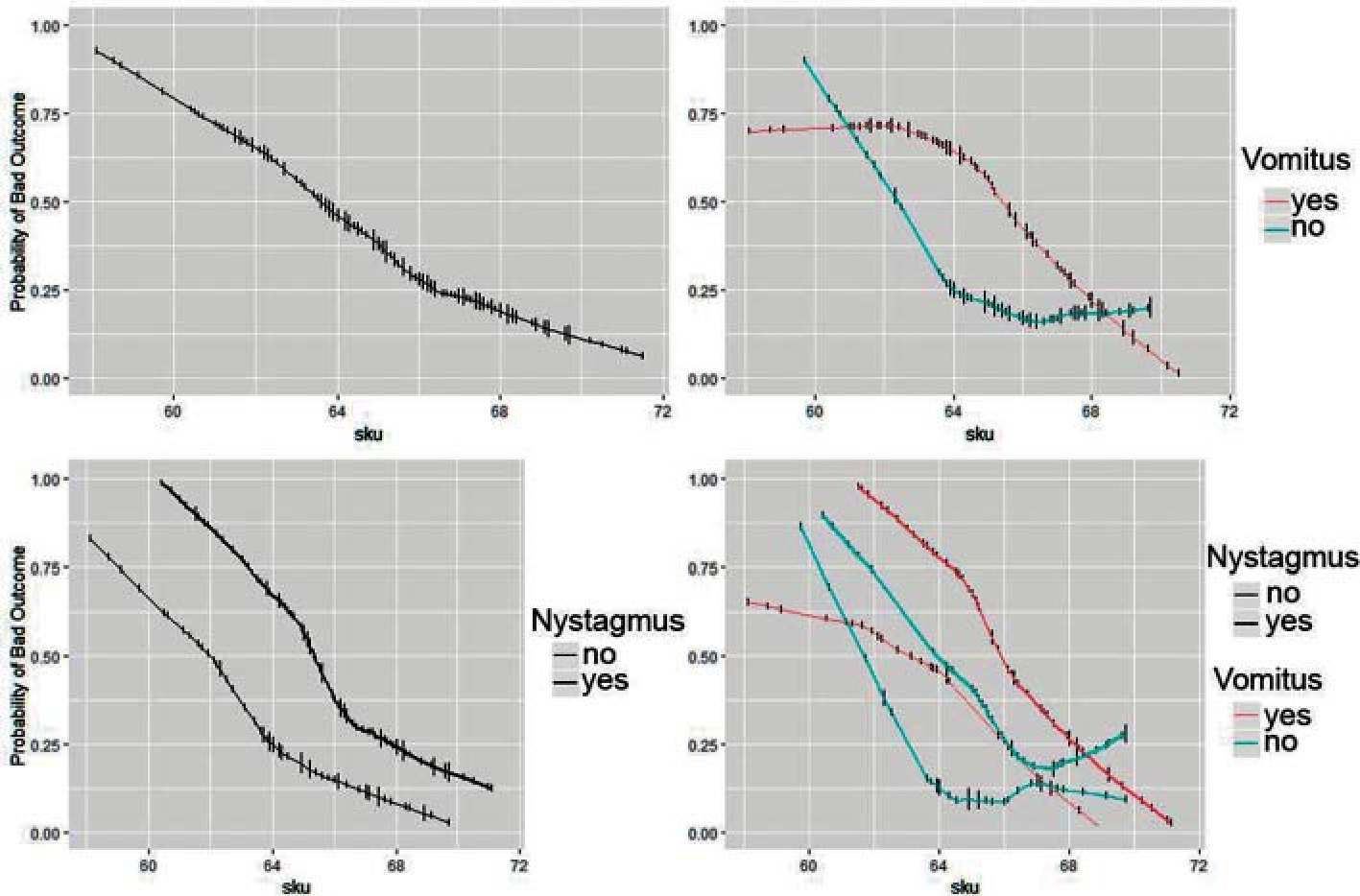p3<-ggplot(df, aes(x=sku, y=OUTCOME, size=NYSTAGMUS ))+histSpikeg(OUTCOME~sku+NYSTAGMUS, lowess=TRUE, data =df)+b+ylim(0,1)+yl+ylab("Probability of Bad Outcome") | |