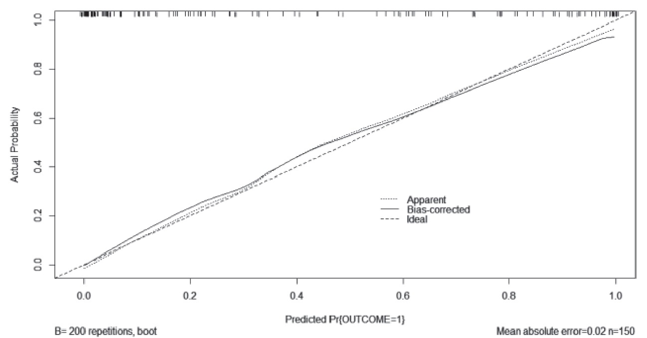 Рис. 5. Калибровочная кривая (КК) для модели исхода (Apparent – КК по оригинальному набору данных, Bias-corrected – КК, скорректированная на оптимизм, Ideal – идеальная КК)