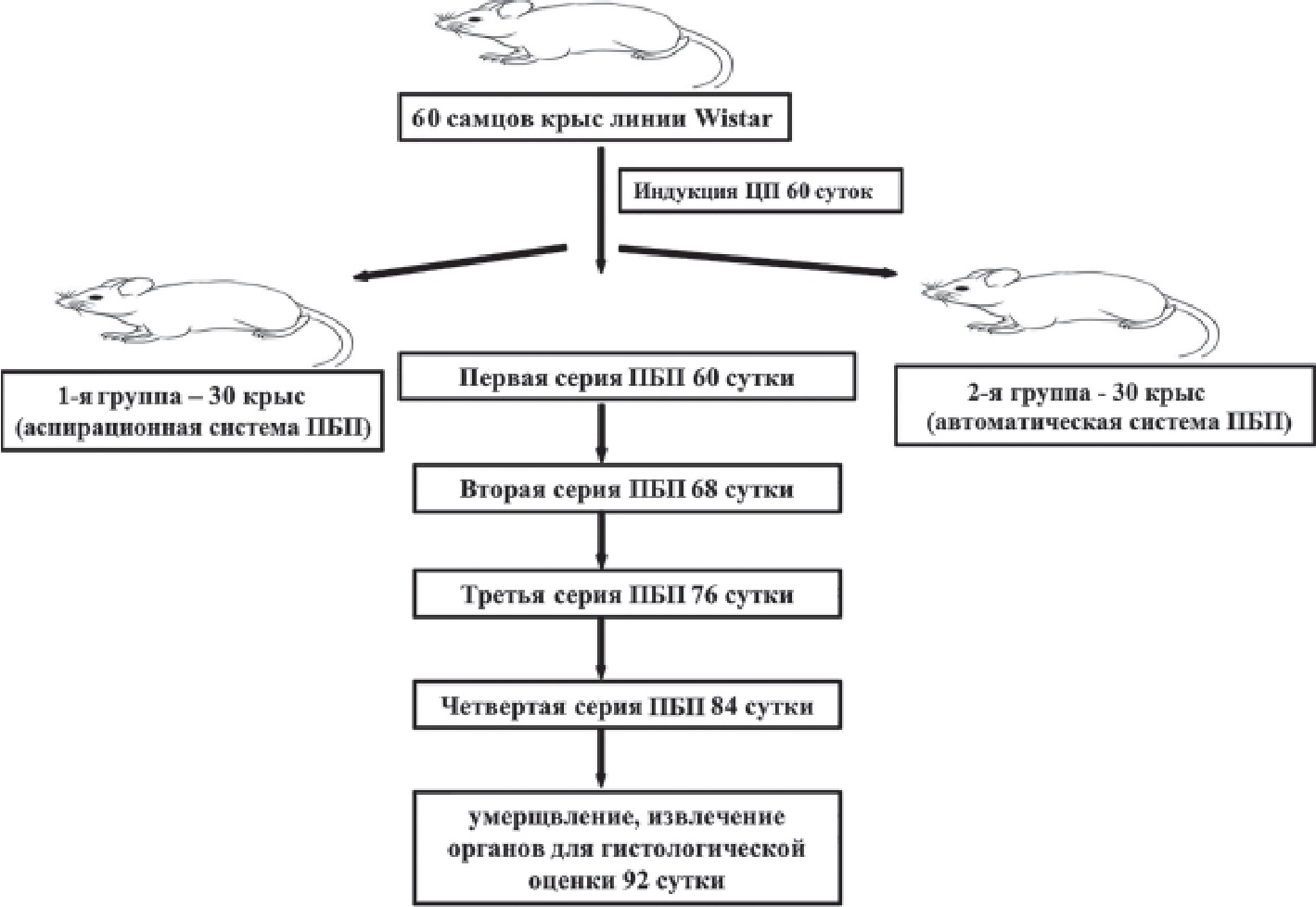 В исследование были включены 60 самцов крыс линии Wistar, массой 250±50 г, у которых индуцировали ЦП. На 60-е сутки эксперимента крысам было прекращено введение 50% четыреххлористого углерода (ССl4) и 10% спирта, после чего они методом случай- ной выборки были разделены на 2 группы: 1-я группа состояла из 30 крыс, которым выполнялась ПБП аспирационной иглой размером 18 G из набора для пункции печени (тип Menghini), а 2-я группа включала 30 крыс, которым выполнялась ПБП с использованием автоматической системы (АС), состоящей из специальной коаксиальной иглы с троакаром (Disposable guillotine needle fop soft tissue biopsy with semiautomatic action 16G20 см, Италия). Алгоритм исследования представлен на рисунке 1.