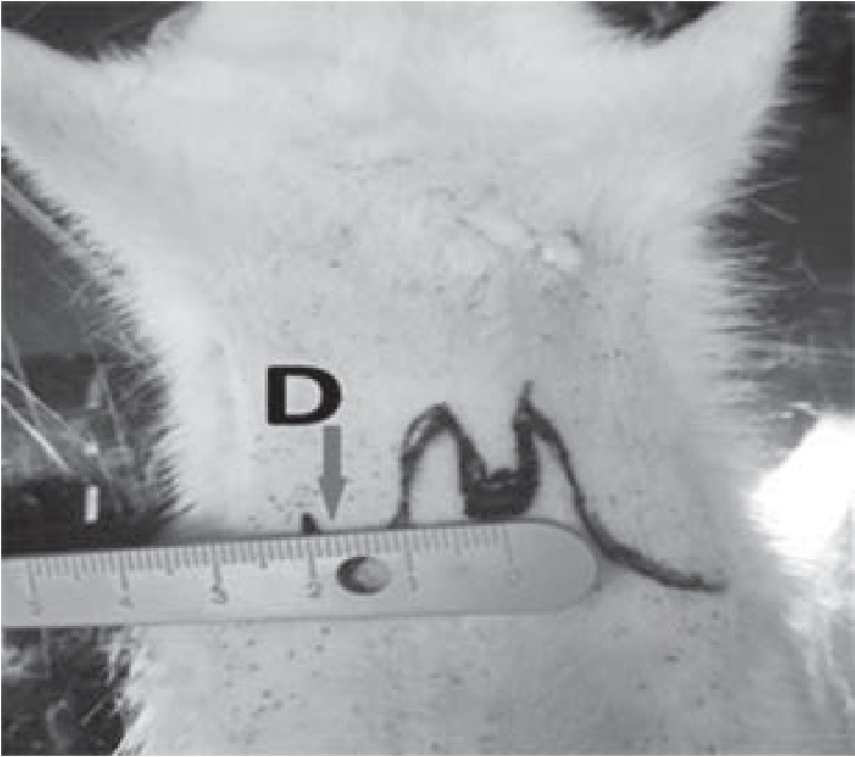 Далее крысам 1-й группы выполнялся разрез кожи скальпелем от точки D в сторону реберной дуги по направлению к мечевидному отростку. Затем определялась точка пункции (Р), которая находилась на расстоянии 0,5 см от точки D в сторону края реберной дуги на протяжении разреза и соответствовала межреберью VII и VIII ребра (рис. 3).