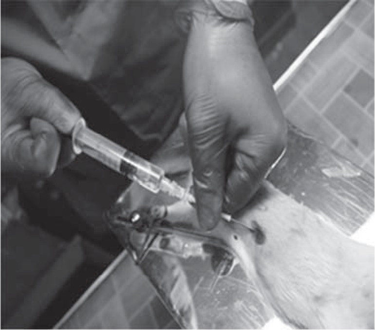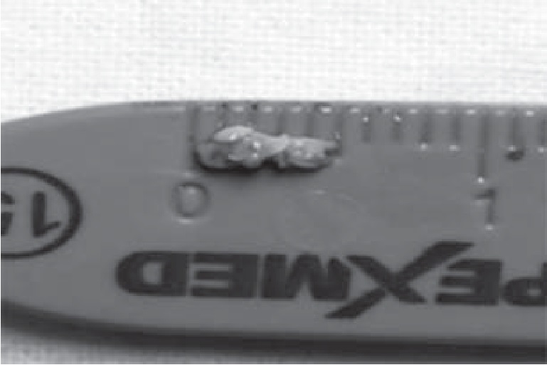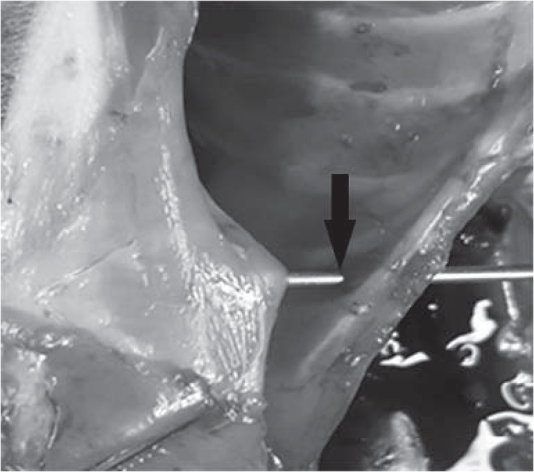 Для отделения биоптата от основной ткани игла без извлечения из печени наклонялась под углом 20–30 градусов к оси прокола по направлению к голове (рис. 6), после этого игла возвращалась в прежнее положение и извлекалась из пункционного канала. Полученный биоптат выдавливался из иглы и помещался в пробирку с 10% формалином (рис. 7).