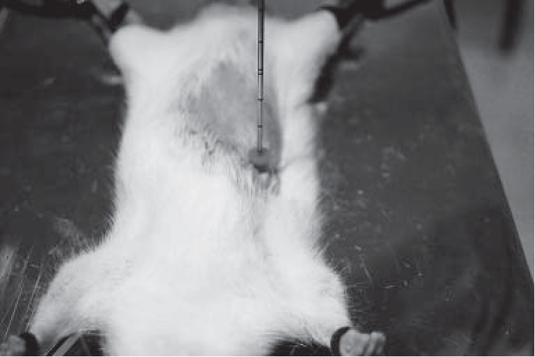 Биопсия печени выполнялась квалифицированным хирургом. В условиях операционной крысам 1-й и 2-й групп вводился общий анестетик диссоциативного действия zolеtil 100 (по 250 мг тилетамина гидрохлорида и золепама гидрохлорида) в дозе 20 мг/кг массы тела. После наступления анестезии у животного сбривалась шерсть в области брюшка и грудной клетки справа, после чего осуществлялась фиксация на операционном столе.