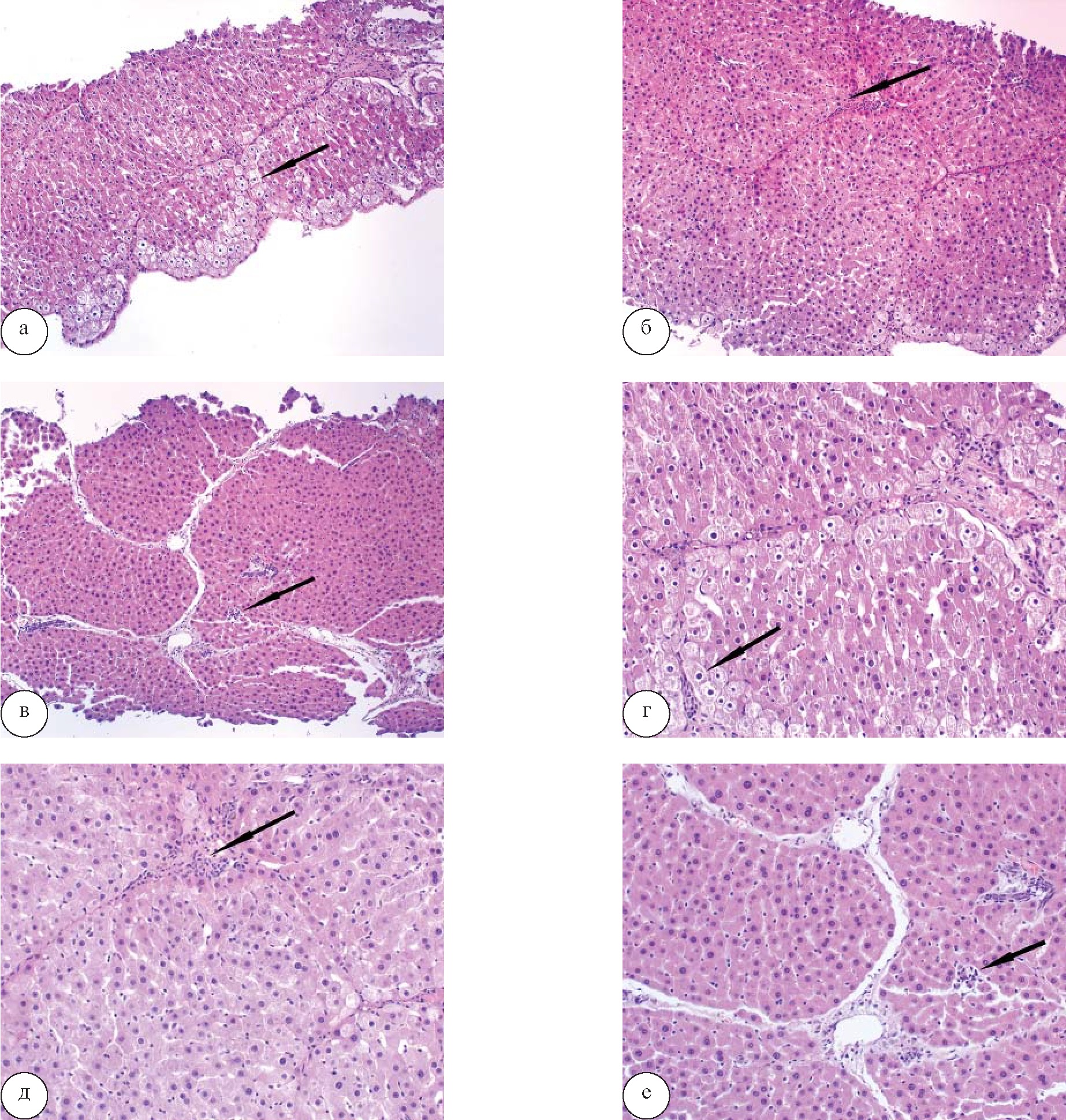 11. Рис. 10. Типовые патологические изменения в биоптатах печени у одного и того же животного после повторных ПБП: (а, б, в – ув. ×10; г, д, е – ув. ×20)