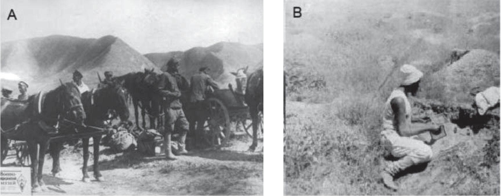 Рис. 1. Паразитологические экспедиции в Среднюю Азию: A – Е.Н. Павловский среди участников экспедиции (Туркмения, 1931 г.); B – за сбором клещей в норах грызунов (Таджикстан, 1932 г.)