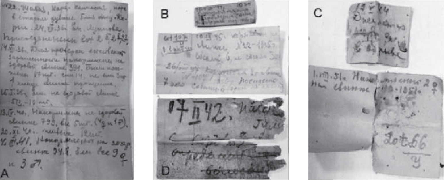 Рис. 5. Описания лотов в коллекции Е.Н. Павловского: A – Узбекистан, Каракалпакия, 1936 г.; B, C – Узбекистан, с. Джулангар, 1944 г.; D – Иран, 1942 г.