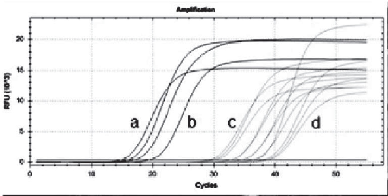 Рис. 6. Кривые накопления флуоресценции, полученные при амплификации мт-ДНК клещей: a-b – контрольные образцы (клещи I. persulcatus, сбор 2017 г.); c-d – исследуемые образцы (клещи O. papillipes из коллекции Е.Н. Павловского)