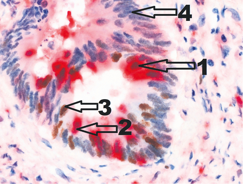 Fig. 1. Differential components of colon adenocarcinoma. Double immunohistochemical staining with antibodies to ALDH1 and Ki-67, with hematoxylin counterstaining. Magnification × 400. The arrows indicate the studied populations of tumor cells: 1 — stem proliferating (ALDH1+Ki-67+); 2 — stem nonproliferating (ALDH1+Ki-67−); 3 — progenitor cells (ALDH1–Ki-67+); 4 — differentiating (ALDH1–Ki-67–)