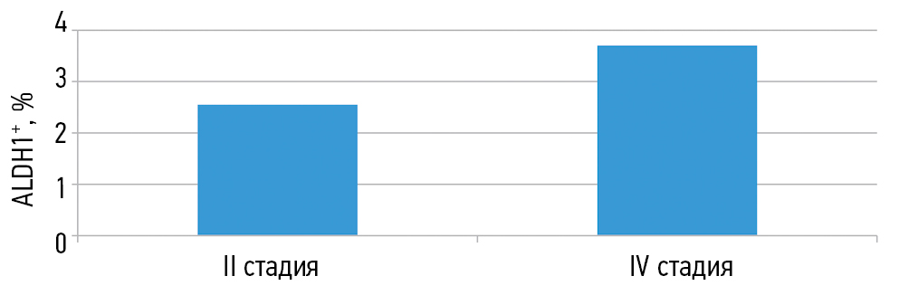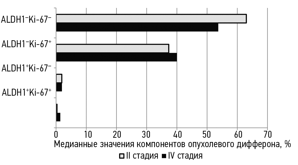 В рамках комплексного изучения популяции СОК определялась их структура с позиции пролиферативной активности. Самой распространенной популяцией в обеих клинических группах стали дифференцирующиеся клетки с иммунофенотипом ALDH1–Ki-67–, меньшая доля пришлась на клетки-прогениторы (ALDH1–Ki-67+). Самыми малочисленными популяциями стали стволовые непролиферирующие и пролиферирующие клетки. Значения компонентов опухолевого дифферона в зависимости от стадии опухолевого процесса представлены в таблице 2.
