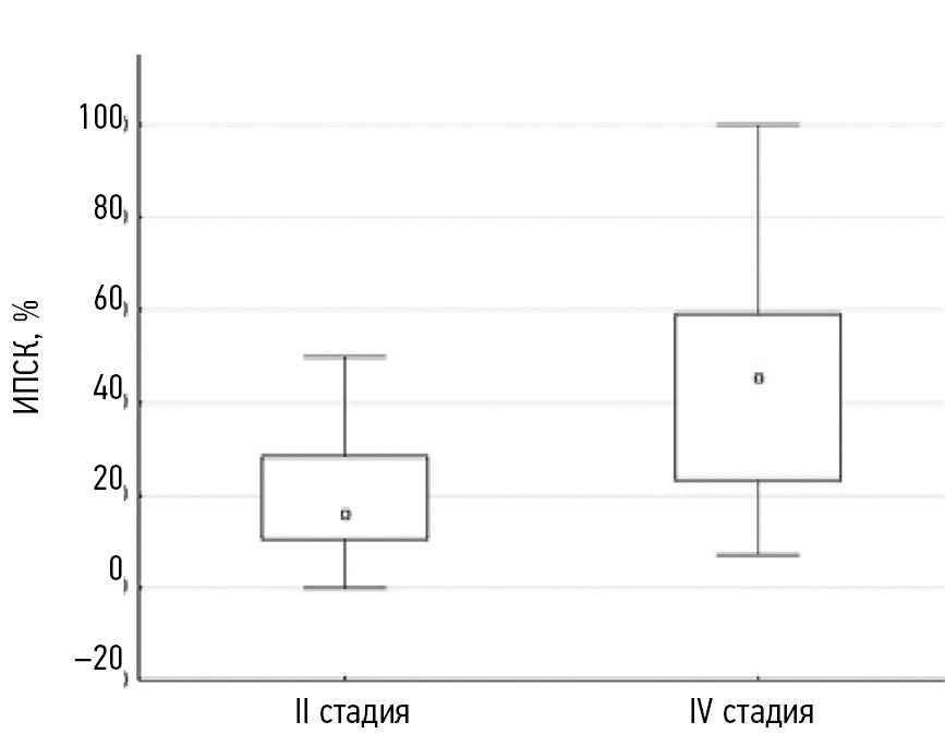 Рис. 7. Корреляция ИПСК c показателем потенциала метастазирования CXCR4 у пациентов, страдающих II стадией КРР