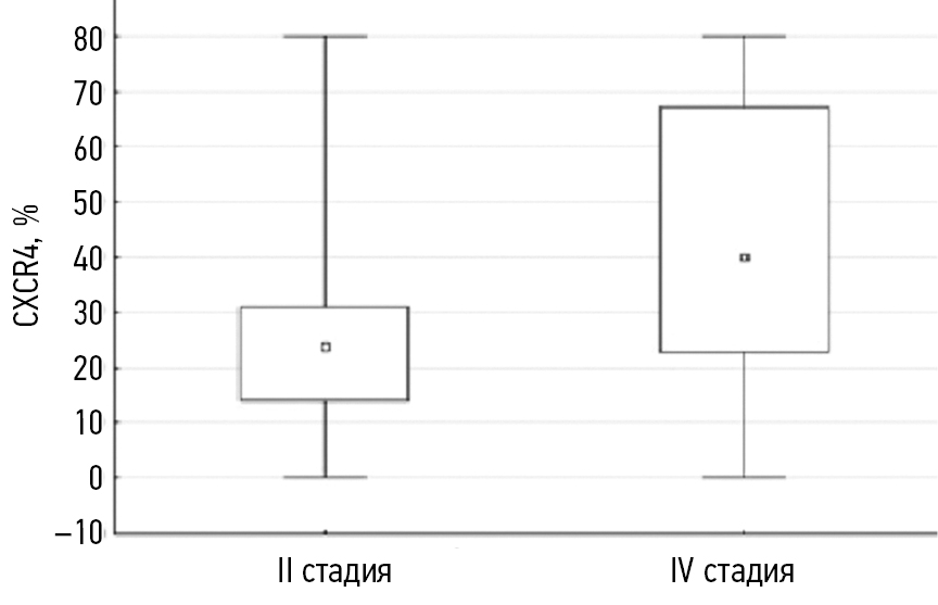 Рис. 6. Экспрессия CXCR4 при различных стадиях КРР