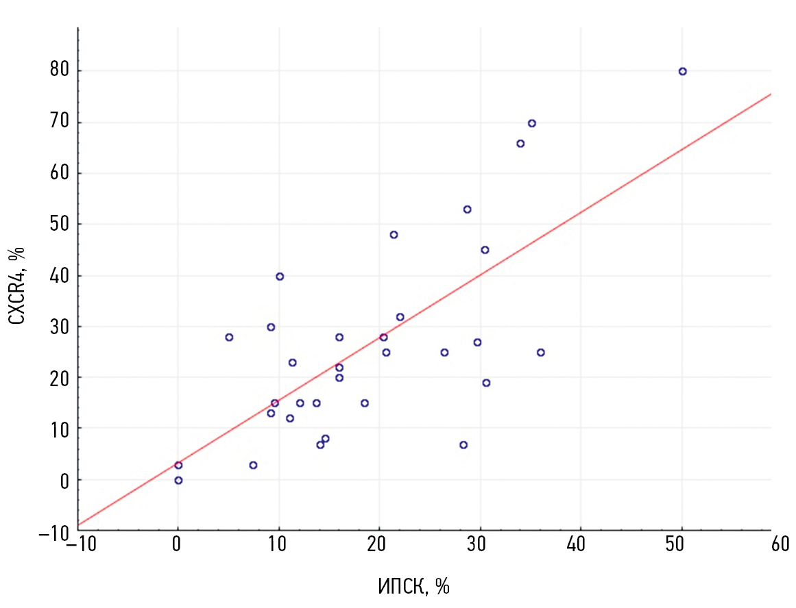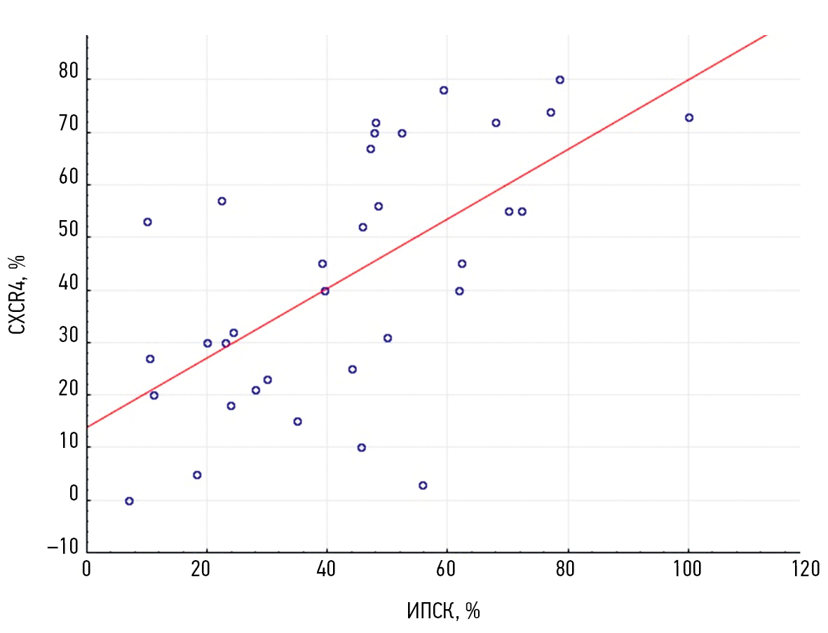 Рис. 8. Корреляция ИПСК c показателем потенциала метастазирования CXCR4 у пациентов, страдающих IV стадией КРР