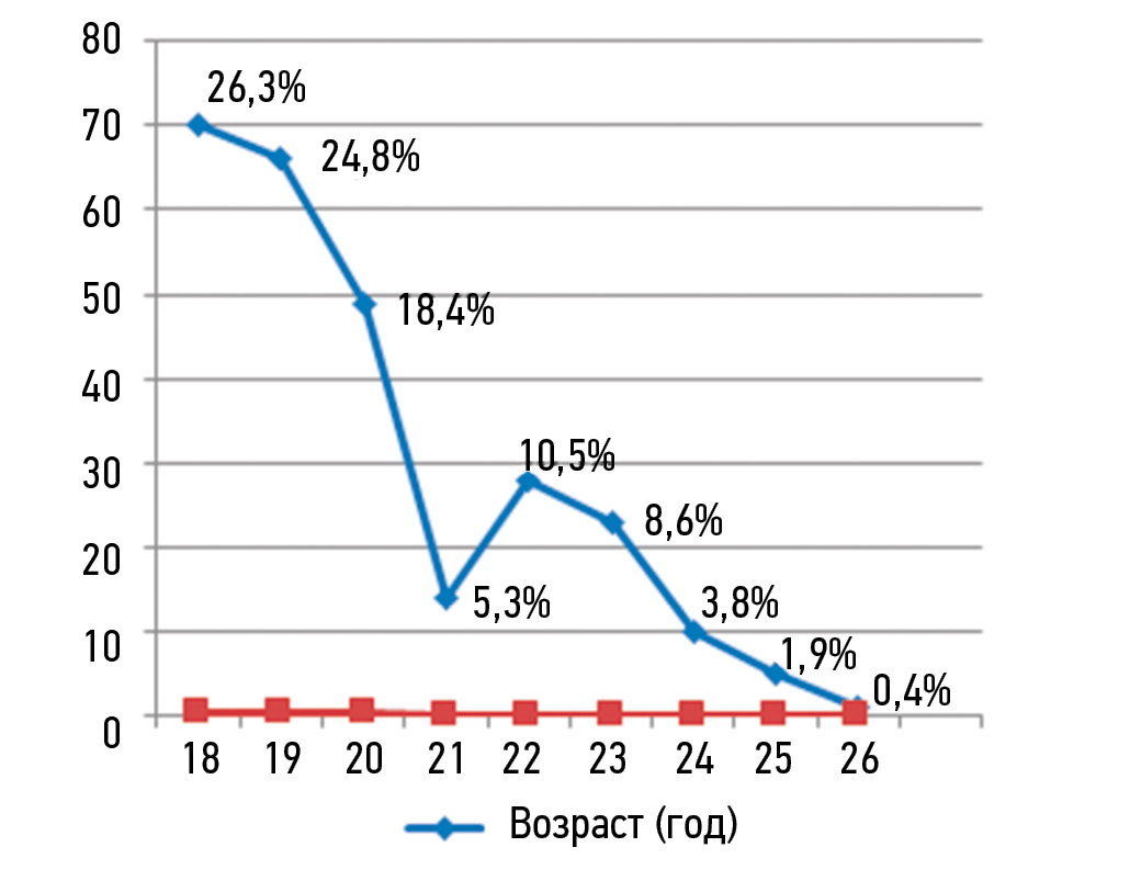 Young recruits are much more likely to suffer from community-acquired pneumonia (18 years-70 people (26.3%), 19 years - 66 people (24.8%), 20 years - 49 people (18.4%). At 25 years of age, the incidence of pneumonia among military personnel decreases by 1.9%, and at 26 years of age - by 0.4%.
