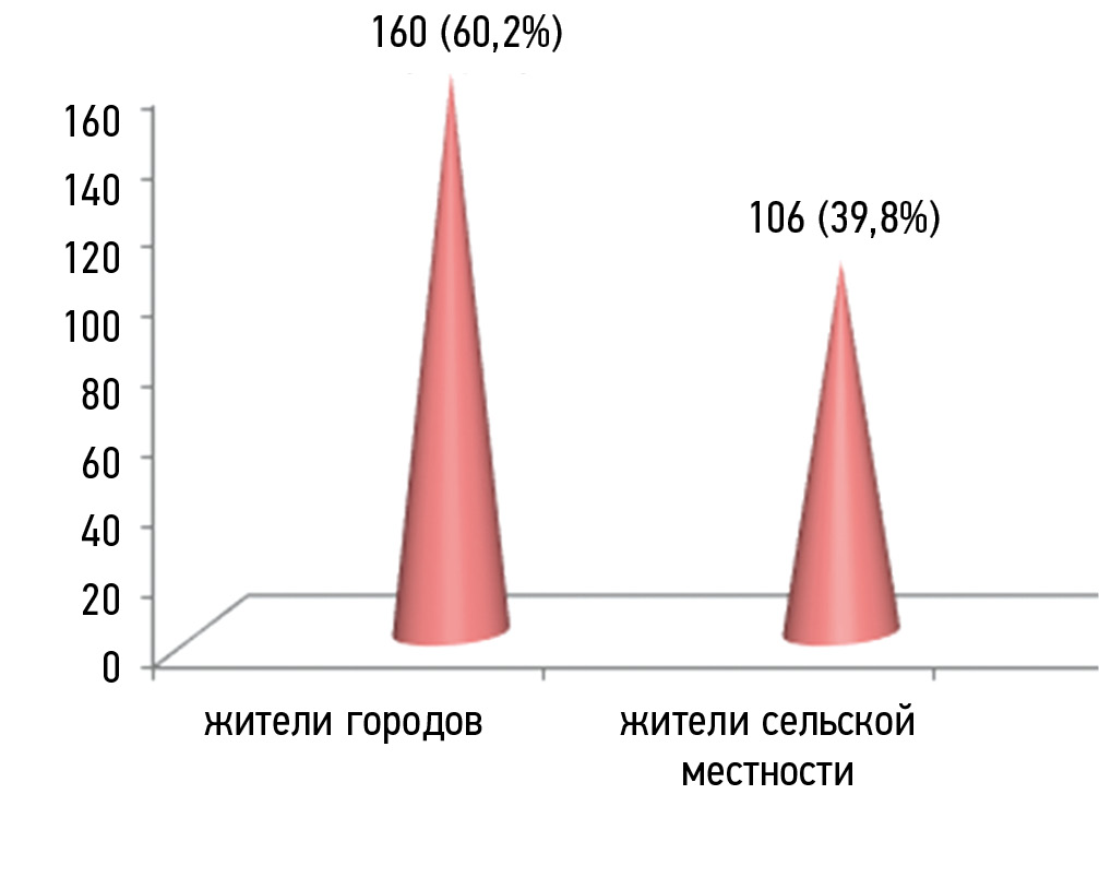 It was found that before conscription, urban residents predominated among young people of military age with respiratory tract infections compared to the rural population. Figure 2 shows the distribution of military personnel by place of residence before conscription into the armed forces. It was also found that it is more difficult for new recruits to adapt to new climatogeographic conditions in the autumn-winter period, which contributes to longer periods of treatment.