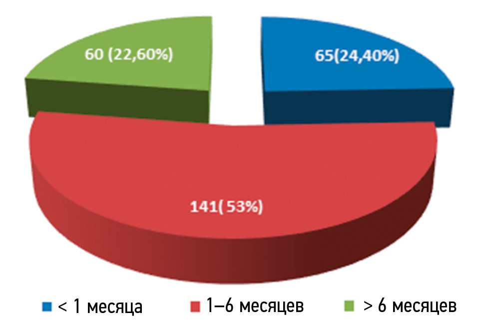 It was found that more often pneumonia is registered in recruits for the period of 1-6 months of their stay in service and according to the results of the study, this figure was 53%. Figure 3 shows the incidence of pneumonia depending on the start of service.
