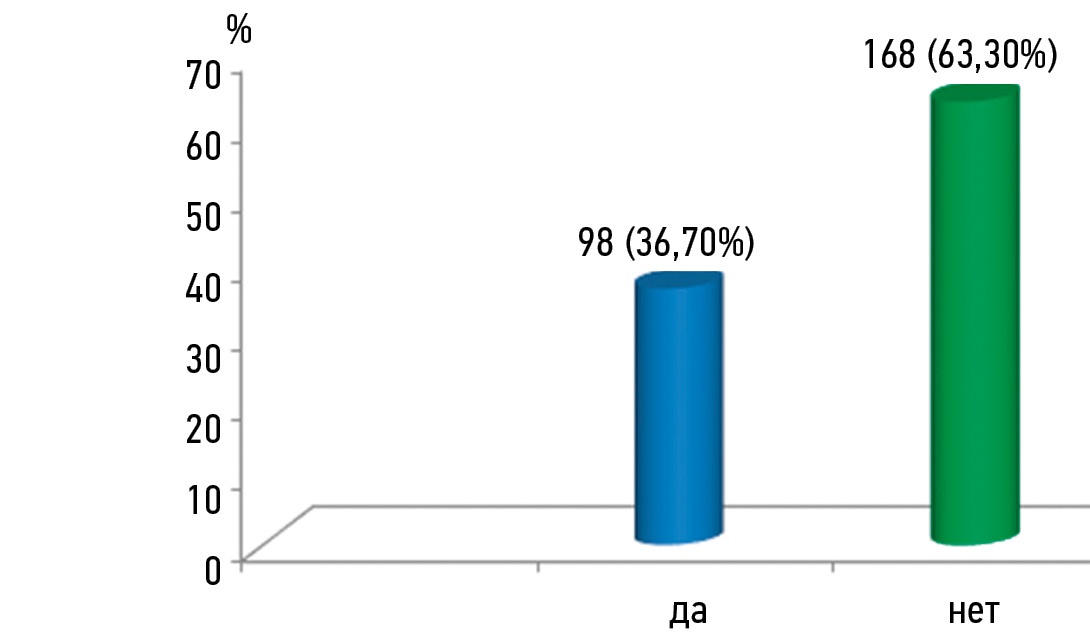 According to foreign scientists, Smoking does not worsen the physical component of the quality of life, but only leads to a decrease in its psychological component [14]. The revealed dependence is explained by the researchers by the presence in the public consciousness of a negative attitude to Smoking and strict restrictions for smokers existing in Western society. At the same time, the impact of Smoking on people's quality of life is still a poorly understood problem. Among military personnel with pneumonia, the fact of tobacco Smoking was detected in 98 (36.84%), while the number of non-Smoking employees was 168 (63.15%) cases (figure 4).