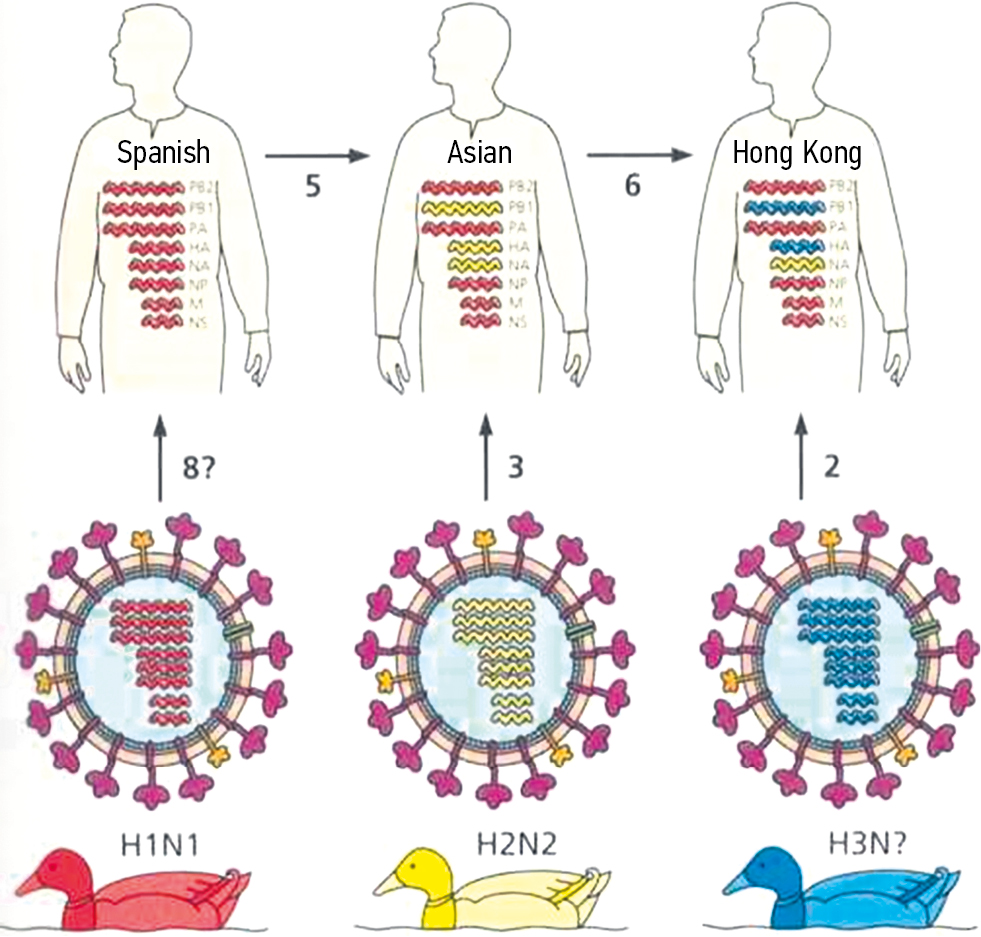 Major influenza pandemics (Fig. 1) are characterized by viral reassortants. The reassortants carried H and neuraminidase (N) genes that had not been in circulation in humans for some time; thus, there was little or no immunity. With the emergence of the new subtype, an influenza pandemic characterized by a new H, or a new combination of H and N had occurred. Segments of the viral genome are illustrated in three colors, each representing a particular viral genotype. Segments and gene products of pandemic strains are labeled in each human silhouette. The numbers next to the arrows show the number of segments of the viral genome replaced in each episode.