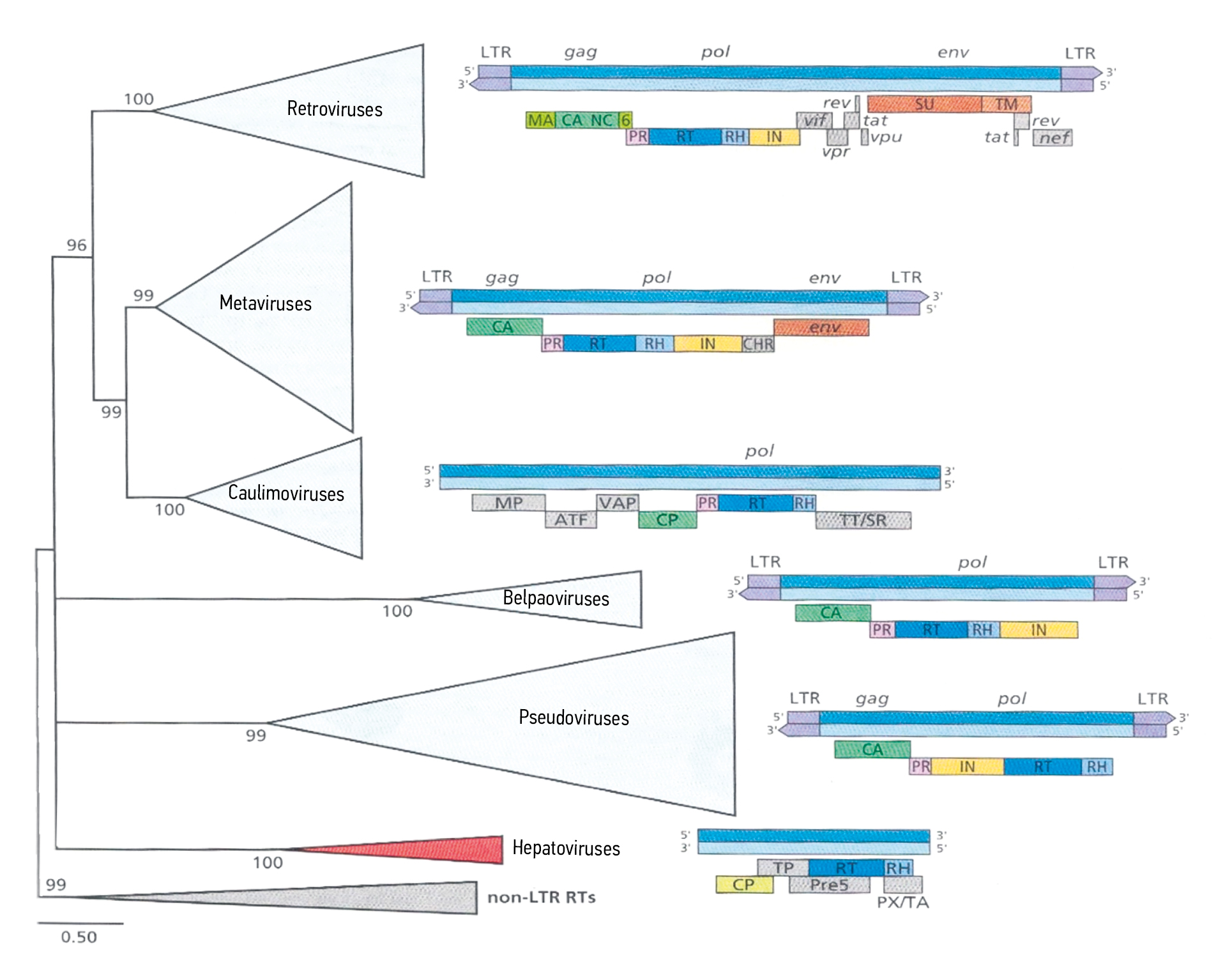 Fig. 2. Phylogeny of reverse transcriptases in retroviruses and pararetroviruses: env — envelope genes; gag — group-specific antigen; IN — integrase; LTR — long terminal repeat; MA — matrix protein; MP — motion protein; NC — nucleocapsid; nef tat, rev, vif, vpr, vpu — human immunodeficiency virus type 1 genes that express regulatory proteins via mRNA; P — polymerase; pol — polymerase genes; PR — protease; PreS — pre-surface protein (shell); PX/TA — activator of protein X/transcription; RH — RNase H; RT — reverse transcriptase; SU — surface glycoprotein; TM — transmembrane glycoprotein; TP — RNase H; TT/SR — translational transactivator/suppressor of RNA interference; VAP — virion-associated protein (аdapted from M. Krupovic et al. 2018. J. Virol 92:e00515-18)