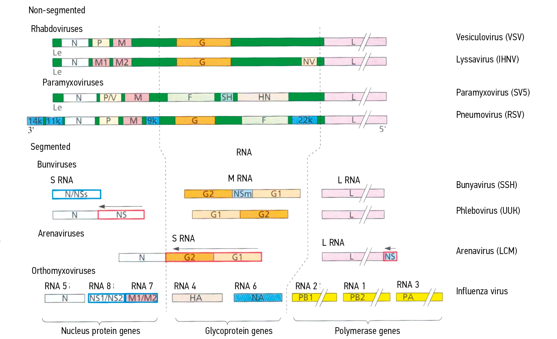 Figure 3 shows that the gene maps of Rhabdoviridae, Paramyxoviridae, Bunyaviridae, Arenaviridae, and Orthomyxoviridae illustrate the similarity of gene products. The individual gene segments of Orthomyxoviridae are arranged according to functional similarity with the other two groups of segmented viruses. Within a given genome, the genes must be scaled. For segmented genomes, genes with blue outlines are those that encode multiple proteins from different open-reading frames. Genes with red outlines are ambisens (arrow).