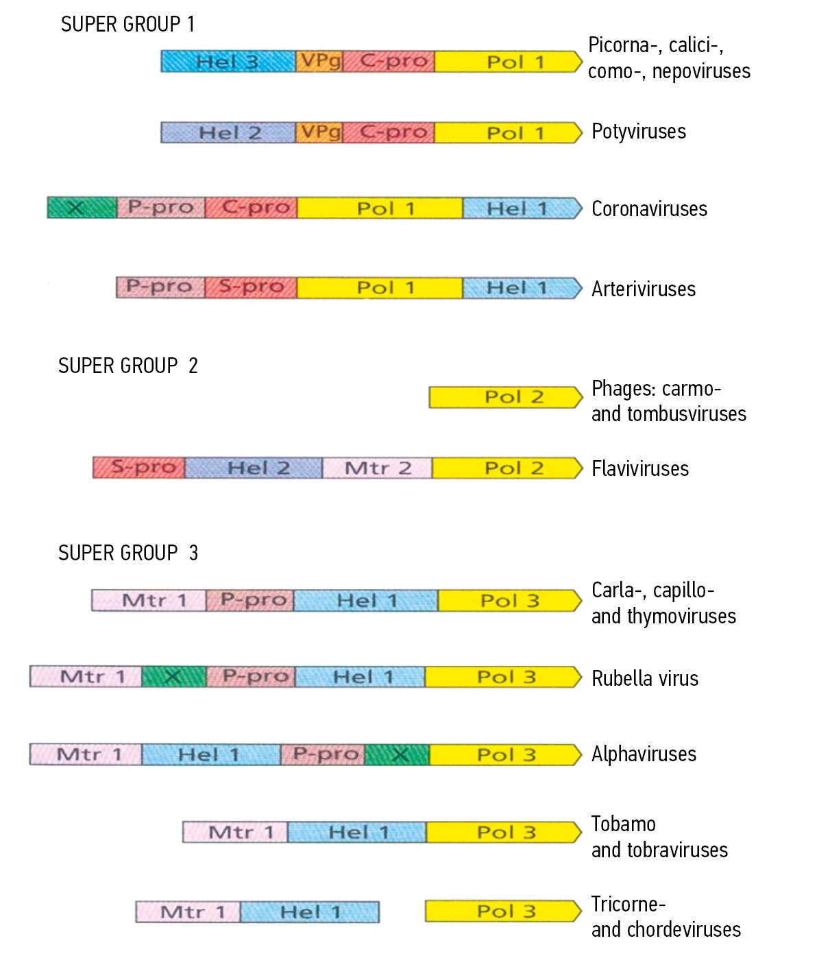 Figure 4 shows that the genomes of (+) strand RNA viruses contain several genes of replicative functions that are mixed and matched in selected combinations over time. These functions include helicase (Hel), genome-associated protein (VPg), chymotrypsin-like protease (C- or S-pro), polymerase (Pol), papain-like protease I (P-pro), methyltransferase (Mtr), and region of unknown function (X). Differences in the polymerase gene define the three supergroups. In the figure, the genes are not scaled, and the structural proteins are omitted.