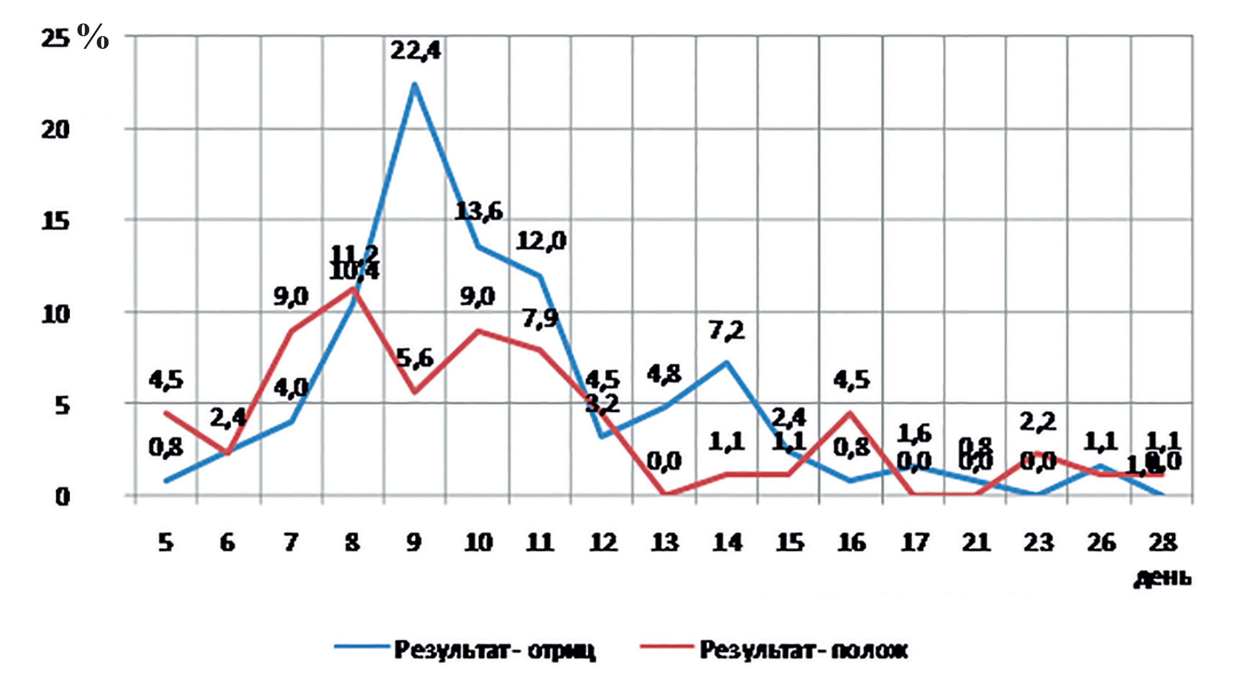Рис. Частота вероятности положительных и отрицательных результатов отделяемого со слизистой верхних дыхательных путей в ПЦР на РНК SARS-CoV-2 в зависимости от сроков их получения