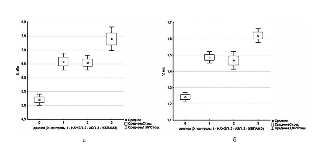 Кроме того, Е и V в группе больных, страдающих ЖБПАМЭ, имели достоверно (p<0,01) большие значения, чем в группах больных, страдающих НАЖБП и АБП, что, вероятно, связано с большим профиброгенным эффектом, наблюдающимся при сочетанном алкогольно-метаболическом поражении печени (2, 4, 13).