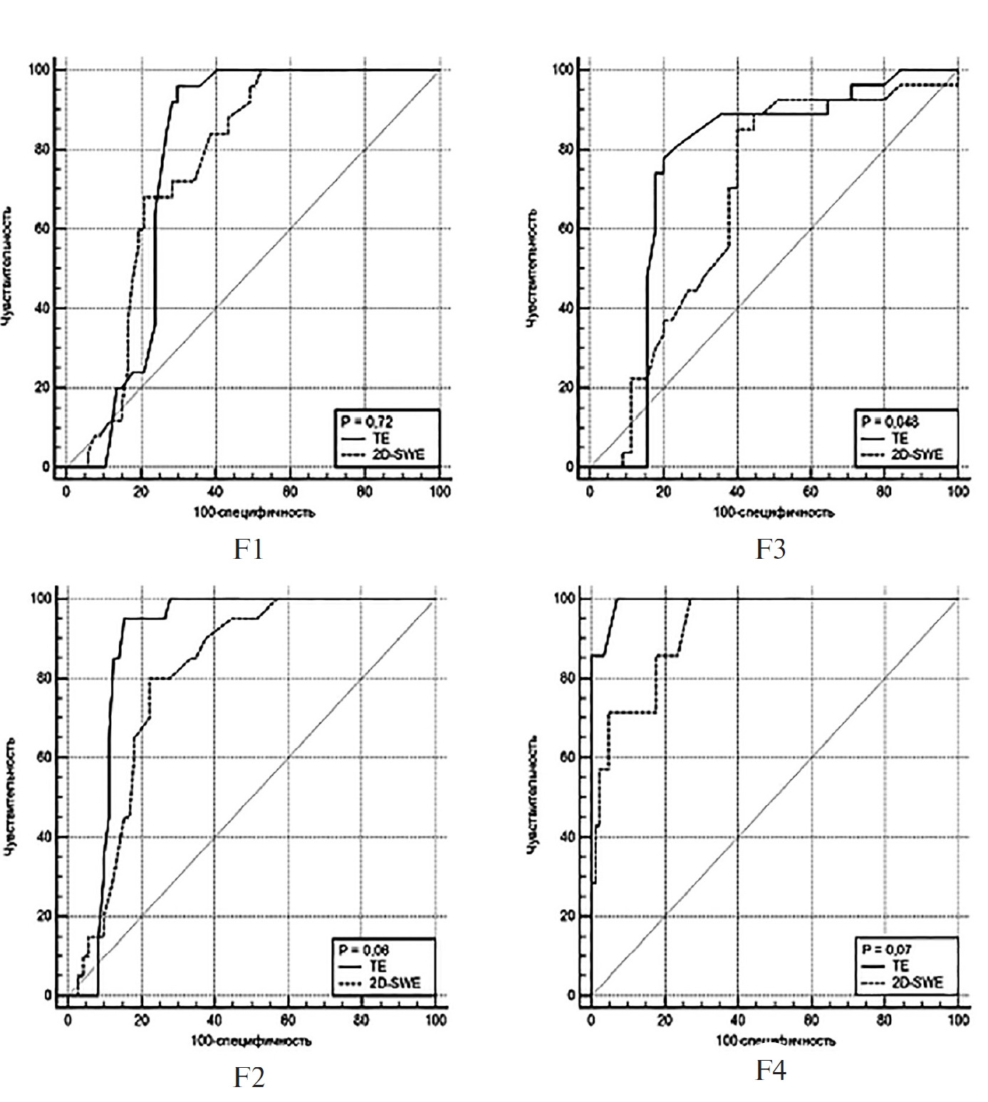 При сравнении значений AUROC двух методик эластографии в диагностике фиброза при ХДЗП достоверные (р=0,048) различия между значениями AUROC в пользу ТЭ отмечались только при F2 (рис. 2).