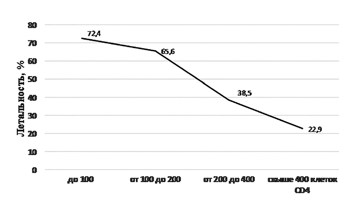 Рис. 1. Летальность ВИЧ-инфицированных пациентов, страдающих туберкулезом ЦНС, в зависимости от иммунного статуса