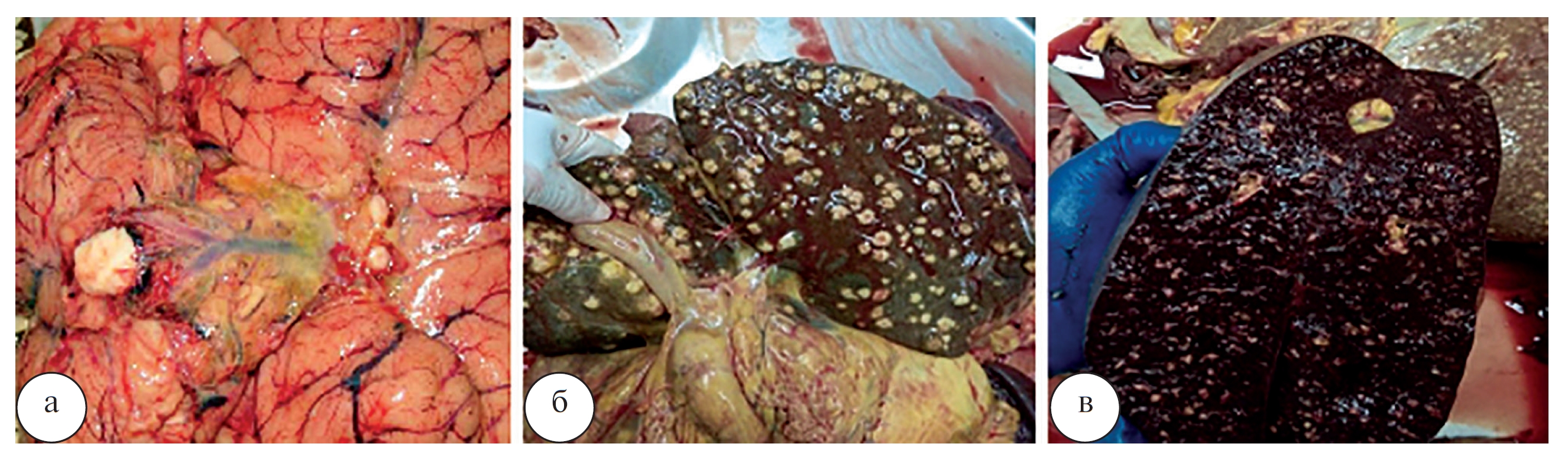 Абдоминальный туберкулез: туберкулез печени, селезенки, внутрибрюшных лимфатических узлов. Фоновые заболевания: зависимость от ПАВ. Хронический вирусный гепатит В и С. Осложнения: полиорганная недостаточность. Интоксикация. Кахексия. Патологоанатомический диагноз: ВИЧ-инфекция. Генерализованный туберкулез (рис. 2): туберкулезный лептоменингит (рис. 2а), милиарный туберкулез легких, почек, печени (рис. 2б), селезенки (рис. 2в), туберкулез внутрибрюшных лимфатических узлов.