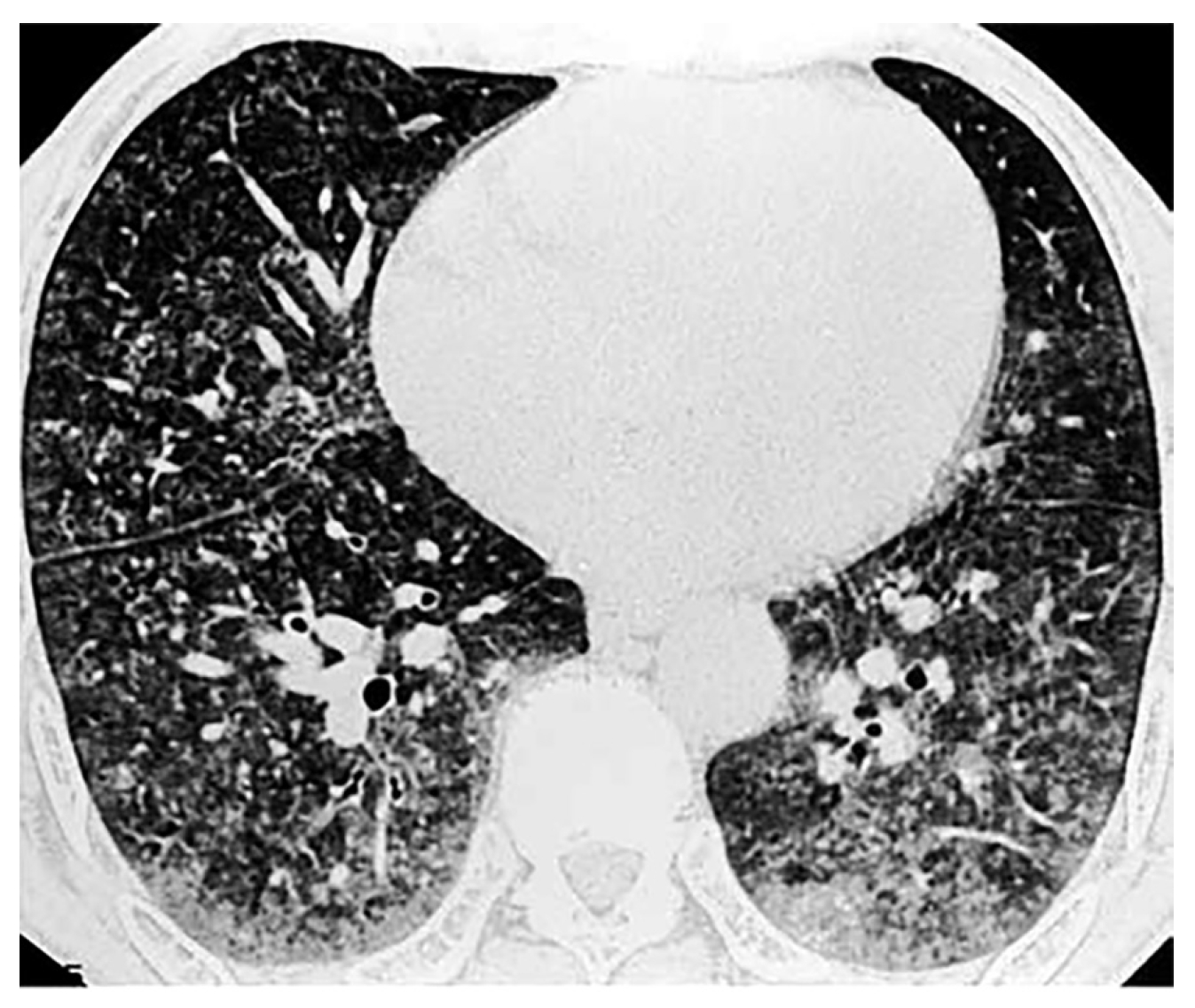 Рентгенологически выявляются интерстициальный ветвисто-сетчатый фиброз (2s) и мелкие (2р) узелковоподобные тени, расположенные преимущественно в средних и нижних отделах и на периферии. В латеральных отделах имеются узелки с тенденцией к слиянию в более крупные (q). Обнаружены рассеянные обызвествленные очаги в нижних отделах в диаметре 0,3–0,5 см больше справа. Корни уплотнены, расширены. Определяется повышенная прозрачность легочных полей в верхних долях (рис. 1).