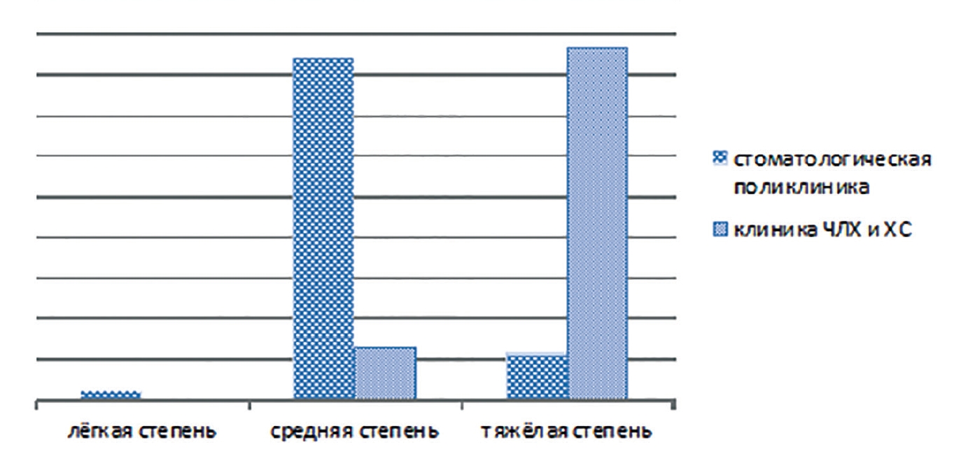 Таким образом, если в стоматологическую поликлинику ВМА большинство пациентов обращалось по поводу ХГП средней степени тяжести, то в клинике ЧЛХ и ХС подавляющее большинство пародонтологических пациентов имели тяжёлую степень заболевания (рис.).