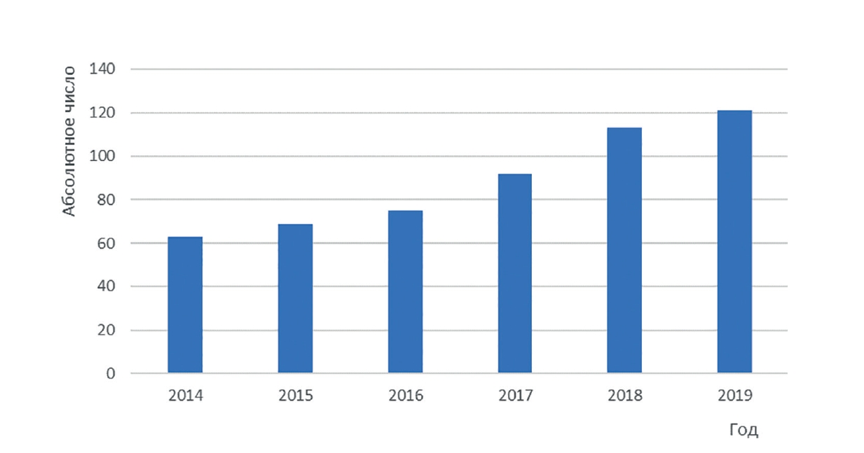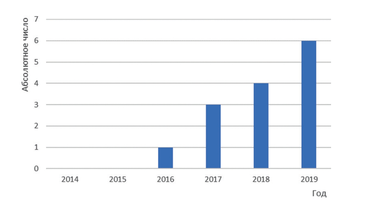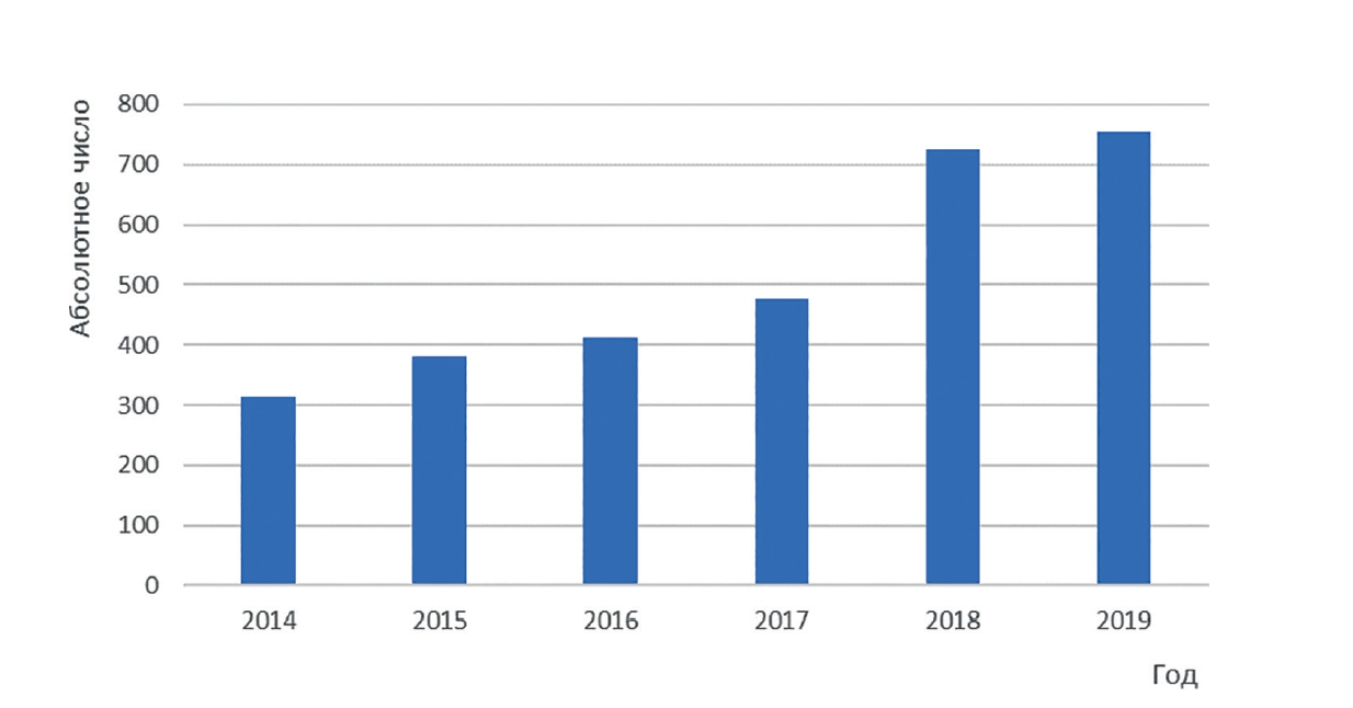 Результаты и их обсуждение. За отчетный период было установлено 3067 дентальных имплантатов, чаще всего имплантация проводилась у пациентов среднего возраста. Количество устанавливаемых дентальных имплантатов в учреждениях МО РФ ежегодно возрастает. На рисунке 1 представлена динамика количества устанавливаемых дентальных имплантатов с 2014 по 2019 г.