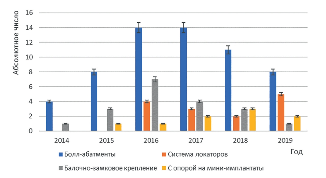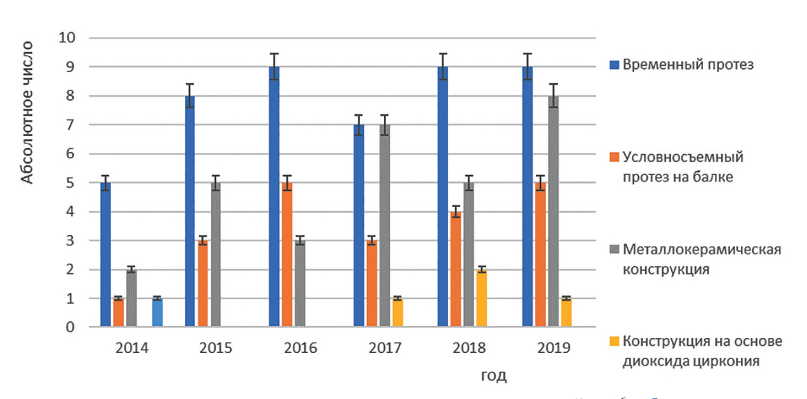 Среди проанализированных историй болезни стоматологическая реабилитация пациентов с полной адентией альвеолярного отростка челюсти (или челюстей) с использованием дентальных и скуловых имплантатов проводилась в 11,6% случаев. Выявлено, что частота лечения полной вторичной адентии, среди пенсионеров МО РФ и прикрепленного контингента составила 9,5%, представленное количество приходилось на все виды ортопедических конструкций. У военнослужащих и лиц из числа прикрепленного контингента обращаемость за стоматологической реабилитацией при полной адентии челюстей ниже, чем аналогичный показатель, в условиях гражданского здравоохранения [2, 3]. Вероятнее всего это связано с ежегодной проводимой диспансеризацией военнослужащих с последующей контролируемой плановой санацией. Наиболее простым способом восстановления жевательной эффективности при полной адентии челюсти (челюстей) в условиях различной степени выраженности атрофии костных и мягких тканей является использование съемных ортопедических конструкций. При выраженной атрофии, особенно нижней челюсти, не удается достичь хорошей фиксации съемного протеза, поэтому в качестве опорных элементов при полной утрате зубов с успехом используются дентальные имплантаты. Распределение изготавливаемых ортопедических конструкций данного вида по годам представлено на рисунке 3.
