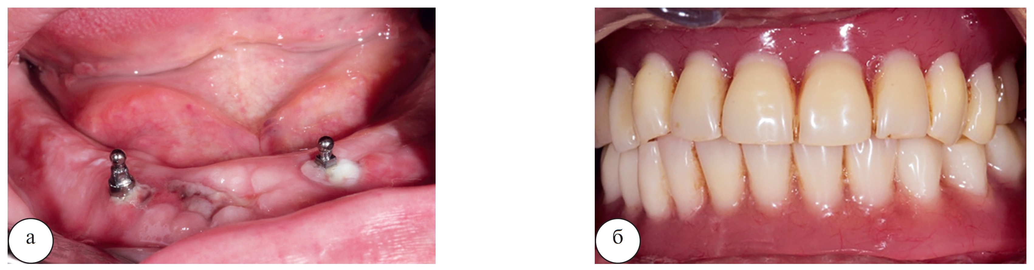 Рис. 4. Этап стоматологической реабилитации пациентки Г. 64 лет, включающий установку 2 одноэтапных миниимплантатов и фиксацию ранее изготовленных съемных акриловых протезов: а – вид в полости рта после удаления зубов и установки мини-имплантатов; б – фиксация протезов осуществлена сразу после операции