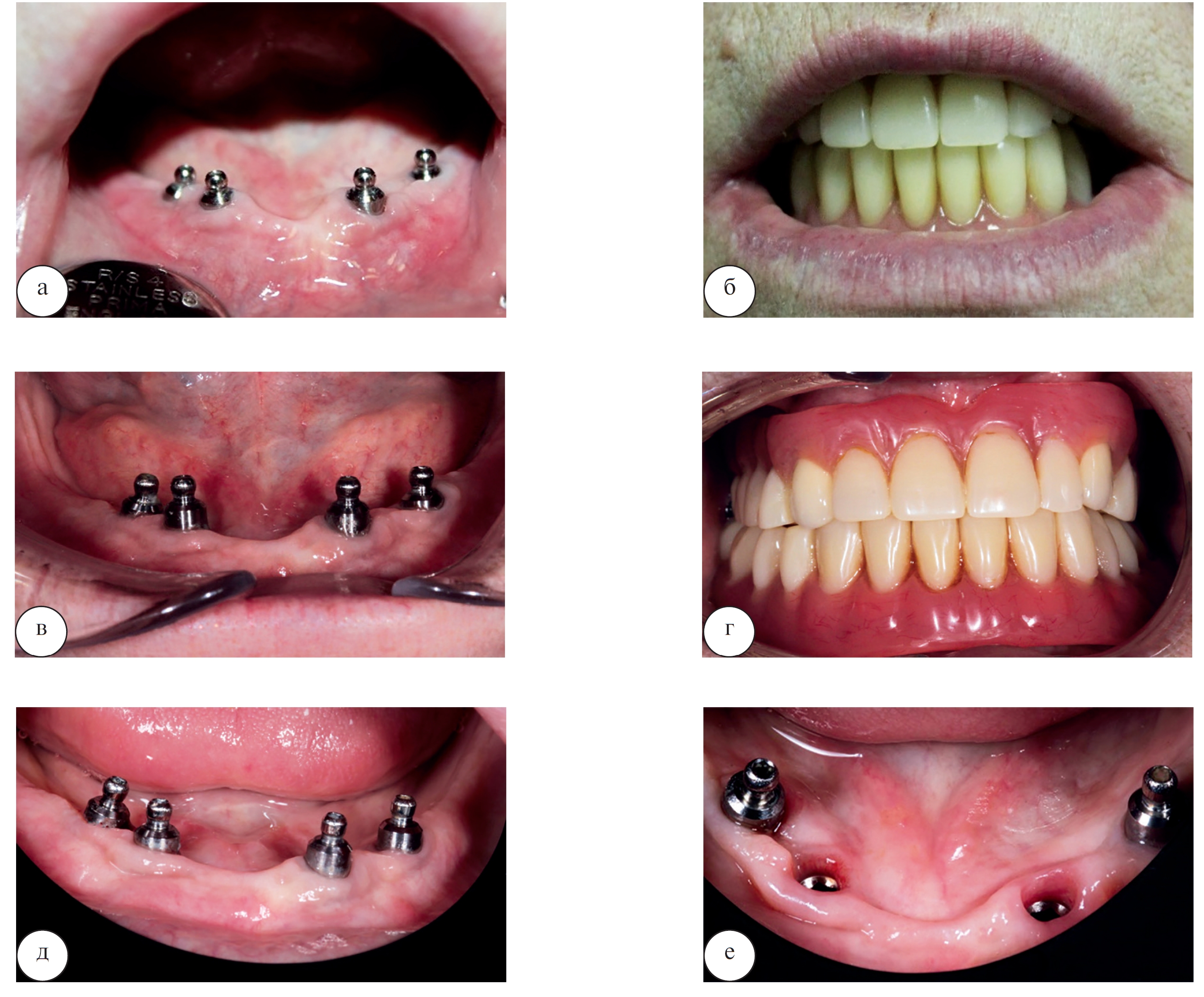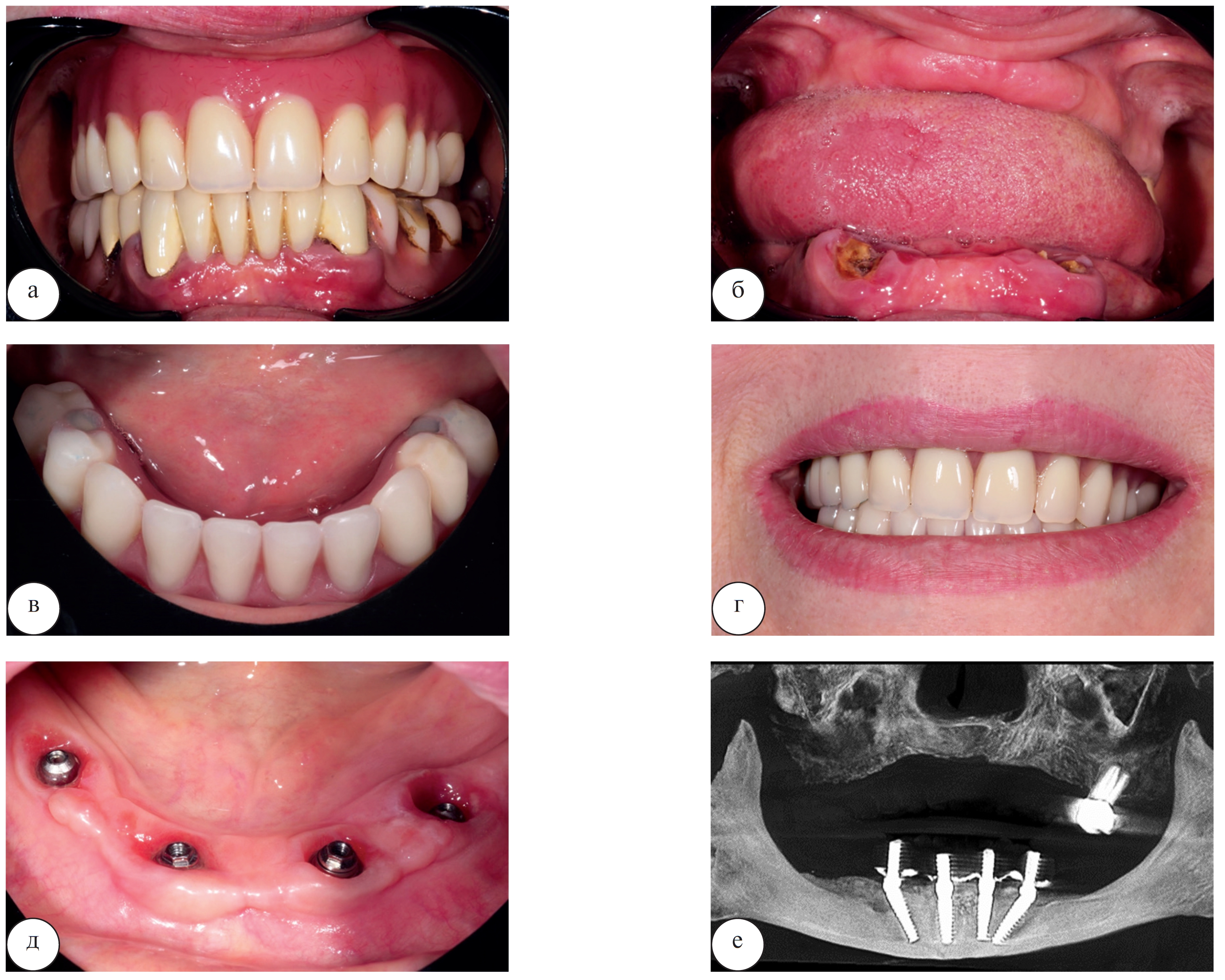 Рис. 10. Стоматологическая реабилитация с использованием протокола на 4 дентальных имплантатах у пациентки Ж. 49 лет: а – исходная клиническая картина в полости рта; б – клиническая картина в полости рта после удаления всех съемных конструкций; в – временный условно-съемный акриловый протез установлен по методике немедленной нагрузки; г – улыбка пациента с временными акриловыми протезами на верхней и нижней челюсти; д – вид слизистой в полости рта на контрольном осмотре через год после операции; е – срез компьютерной томограммы через год после операции